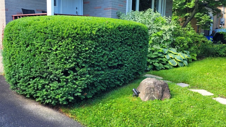Although it's tempting to plant rows of single specimens for a formal look, it makes your privacy hedge susceptible to pests and diseases. Leyland cypress or boxwood hedge planters can probably attest to that, considering how efficiently bagworms and blight take over, compelling their removal. So, it's ideal you plant mixed rows of evergreen shrubs (like mountain laurel, yew, and inkberry) so that their attractors (pollinators) can keep each other's detractors (pests) in check. This way, you can also enjoy a different pop of color year-round. Before planting, ascertain whether the selected variety's height adheres to your local community's or HOA's guidelines and is appropriate for your lot's size. Here are nine of the best evergreen hedges and shrubs for privacy in winter.