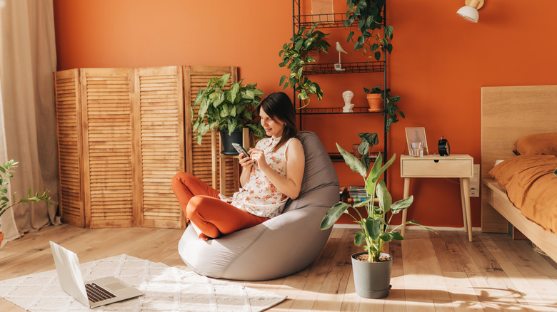 On the other hand, your terracotta won't feel dated if you simply lean in to the rustic look. There are a ton of creative ways to use terracotta tile in your home. If you have terracotta flooring, try to connect it to your outdoor space as much as possible. Try adding potted trees and plants to your living space. You could even place fresh cut flowers on your kitchen countertops or living room mantel if you don't have a green thumb. If possible, connect your indoor space to the outside using matching terracotta pavers or by incorporating textiles like woven fabrics and natural fibers in a sunroom or patio. Wood, stone, and textiles can really elevate a rustic home design and pair perfectly with terracotta.