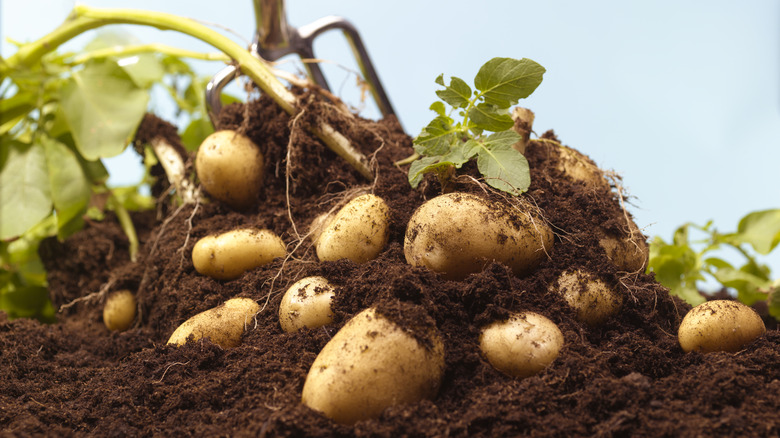 Potatoes (Solanum tuberosum) have a great symbiotic relationship with broccoli in a garden since they both pull different nutrients from the soil and don't compete with each other. While potatoes thrive and yield a high return on phosphates and magnesium, broccoli flourishes in nitrogen-rich soil and loves calcium as well. Both plants overall require quite a bit of heavy "feeding" — meaning they take up large quantities of nutrients — but they don't butt heads.
