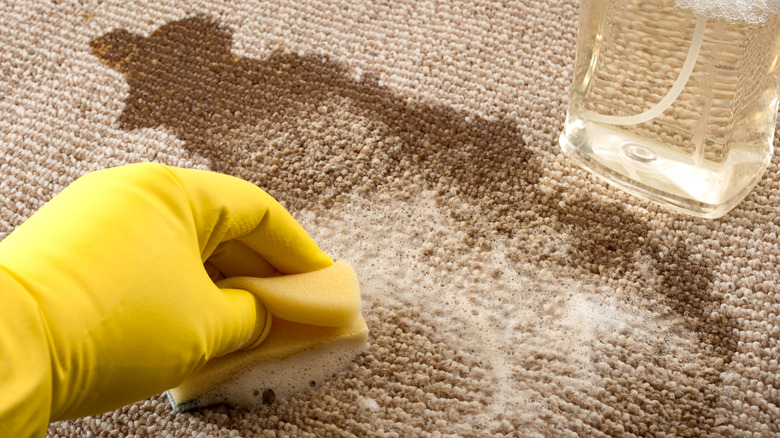 When cleaning lighter-colored carpets with hydrogen peroxide, stick with a concentration that is no higher than 3%. This will minimize the risk of any bleaching. Combine the hydrogen peroxide with water in a spray bottle (1:1 ratio) and test it on an inconspicuous section of the carpet before tackling the stain. After confirming that it did not alter the color, use the solution to spray the stained area. Use a soft-bristled brush, such as the WDDBHSKN Cleaning Scrub Brush, to agitate the stain before letting the solution sit for five minutes. Rinse the area and blot up all the excess cleaning solution.