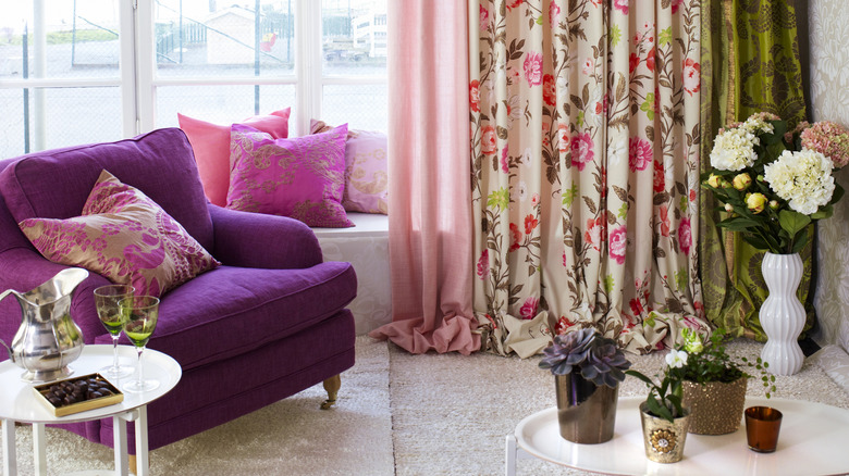 While the growing trend of warmer, nature-inspired hues includes loads of deep browns and lush greens, a second trend is emerging. Bright and playful paint colors are making their way back into 2025 home trends. If forest tones aren't inspiring, you can play with lilac, bright blue, sparkling pink, and dynamic gold. To go along with these newer palettes is the bold curtain trend that will be taking over in 2025, and that's pattern. With complex, colorful, and beautiful patterns — from botanical prints to abstract geometric shapes to unique art-like panels — patterned drapes are going to be decorating rooms like never before.