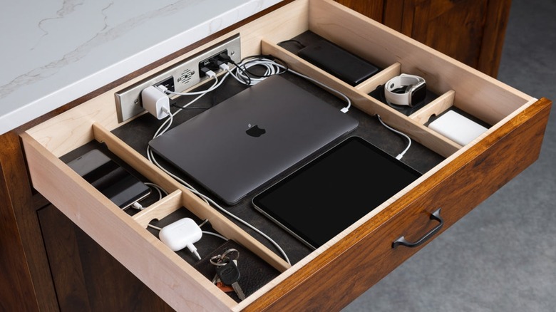 This design idea is great for anyone who wants to cut down on electronic countertop clutter. It also helps those who are prone to losing cables, earbuds, and the like: A drawer like this keeps electronics in one place and provides a dedicated storage spot. If needed, you can put a lock or childproofing latch on the drawer to restrict access to little ones. For ease of installation, it's possible to buy a pre-made solution like the eponymous Docking Drawer. This product plugs into an outlet inside the cabinet and is essentially a drawer with a built-in power bar.