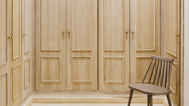 Add a trendy, luxe feel by adding wood trim in a sophisticated geometric pattern and painting the doors a deep, jewel-toned color. Classic, mid-century styled spaces can be elevated by covering the doors in thin slats of wood trim, laid vertically side by side, and stained to complement your color palette. Alternatively, mount wood veneer squares with glue or nails (or both) onto the door, creating an inset-grid pattern. These Sauers wood veneers from Amazon are around $10, and come in a variety of colors.