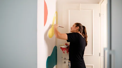 Can't decide on a painting technique? The simplest approach would be to stick to a solid color — it's easy yet still delivers a wow factor if you opt for a vibrant hue. Think pink, blue, or yellow. You might even want to pull colors from your artwork to create a cohesive arrangement. Or, as an alternative, pick a slightly lighter or darker shade than your wall color if you're worried about the result being too overwhelming. For those feeling extra daring, consider decorating with patterns around your art. A checkerboard background, a dotted border, and small doodles are all beautiful ways to add trendy, whimsical accents to your home.