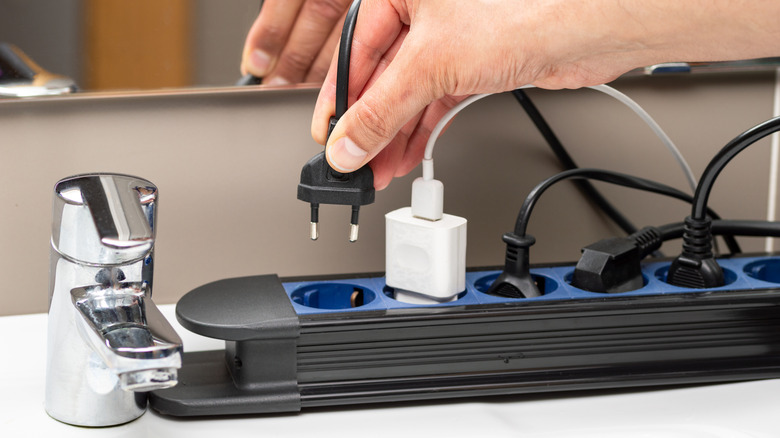There are ways to reduce bathroom counter clutter with cool power socket solutions, all of which are affordable. Cable management boxes can conceal wires and cables for hair dryers, electric toothbrushes, smart wearables, shavers, mobile phone chargers, bluetooth speakers, and other devices commonly used every day in the bathroom. For instance, a footlong basic black box from Bates Choice sells for $12. Boxes get more expensive for stylish options in wood, bamboo, and rattan, although most are under $50. Outlet shelves are especially good for inconveniently-placed outlets without surfaces underneath, with many varieties available online for well under $20.