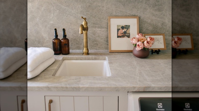 Unfortunately, the qualities of leathered quartzite that make it a great choice aesthetically are the reasons why this type of countertop can be tricky to maintain. One of the downsides of quartzite countertops is that the textured surface of this finish makes it more porous than polished or honed ones; therefore, it can stain easily. This means you have to be careful if you're choosing this countertop for areas prone to spills, like your kitchen, laundry room, or bathroom. However, the care needed to keep your leathered quartzite from staining is not any different than that needed for most natural stones. Ensuring to wipe spills promptly is ideal and you should also clean the surface regularly with a damp microfiber cloth to keep any dirt buildup to a minimum. A pH-neutral stone cleaner also helps to maintain these countertops.