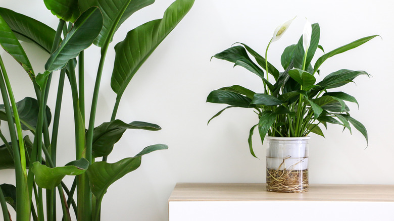 If you want to keep your peace lilies as healthy as possible when minimal lighting is available, there are a few things you'll want to consider when deciding where to place them. First, these plants are sensitive to colder temperatures — they prefer warmer conditions, with an ambient temperature between 68 and 85 degrees Fahrenheit. They absolutely should not be kept in any spaces where the temperature drops to 60 degrees or lower, so a peace lily isn't a good candidate for a cold basement (or other areas that regularly receive chilly drafts from nearby doors or windows). These plants also prefer moderate humidity levels. When you consider these criteria, a dim bathroom with at least some natural lighting might be the ideal location for a peace lily. Just take care to avoid placing the plant directly next to a heating or air conditioning vent, as a steady stream of either hot or cold air could damage it.