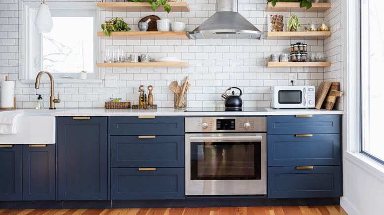 Perhaps unsurprisingly, shades of blue evoke a sense of repose. Blue can also give the feeling of order (think navy blue military uniforms). What's more, this evocative cabinet color is one of the best for hiding dirt and grime in your kitchen. Carry these vibes into your space by going for a rich sapphire or an almost-black navy. Soften the rigidness that can come with an intense blue by pairing it with a soft shade of cream, or even a paler shade of the same hue.