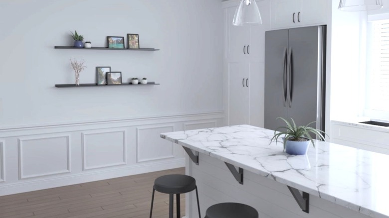 If your kitchen feels flat, the walls are another impactful area you can upgrade, and there are lots of ways you can add texture to them. Wainscoting is a decorative wall paneling method that's been around for centuries and home design celebrities like HGTV's Joanna Gaines use this easy way to bring texture into a boring room. Picture frame molding is another option to consider that can add additional texture, especially if you opt for something with a more ornate trim profile. Both of these options are ideal for more historic homes where wall molding and paneling will fit right in with the architecture. Of course, putting wainscoting or picture frame molding in a kitchen is only possible if you have open wall space. It makes a great addition to kitchens with breakfast nooks. Either DIY or hire a professional to add texture to your kitchen with wainscoting. Build it yourself by adhering wood paneling, beadboard, or vertical shiplap to the lower half of your wall, or by mounting trim in evenly spaced rectangular shapes to create picture molding. An easy way to execute this is by using a kit like Art3d's Pre-cut Wall Molding Set. The three-piece set is only $74.99 and covers about 110 square feet, but you may need to order more depending on how much wall there is to cover. In comparison, a professional wainscoting job costs over $1,500 on average for a 100-square-foot area.