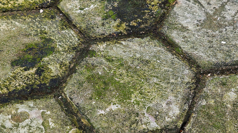 Chlorine bleach is not as environmentally or plant-friendly as other solutions on this list, but it can be extremely effective at removing stubborn algae growths. It provides a much more aggressive approach that can damage nearby plant life and animals — especially if you're spraying near a pond. It isn't advisable to try this method near small bodies of water. Instead, opt for one of the gentler solutions. But if you need to use this method near any other plants, it is best to spray them with water to proactively dilute any overspray that may occur. This solution can also be extremely harmful to the user, so ensure you're taking the necessary precautions, including wearing old clothes as well as eye and skin protection.
