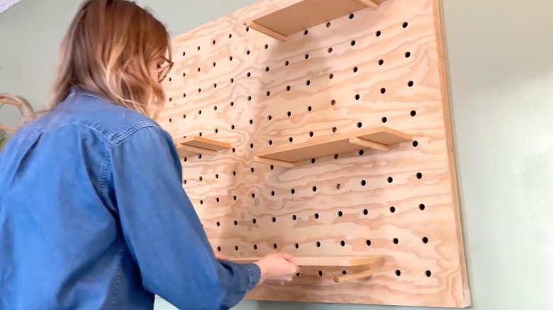 You can build your wall-mounted peg shelf with thick plywood, MDF, or OSB sheets (e.g., ¾-inch plywood). Get the flattest pieces possible, being careful to choose a good piece of plywood for your project. You can also use several pieces of dimensional lumber, stacking them horizontally to fill your wall from top to bottom.