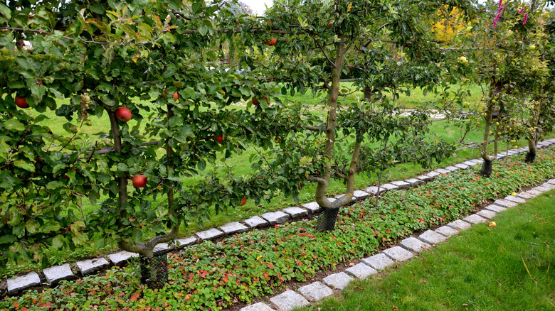While just about any plant growing near a tree will compete with it for water and nutrients, grass can be so aggressive it outcompetes a tree to the point that it's never able to develop a healthy root system. Weak roots, in turn, slow your tree's growth and inhibit fruit production. In a study by the Department of Horticultural Sciences at the North Carolina State University (via the Journal of the American Society for Horticultural Science), researchers found that apple trees grown in mulched beds had thicker trunks than trees growing alongside grass. Moreover, over the multi-year experiment, trees growing in mulched beds began to produce apples by year three, while those surrounded by grass had yet to develop any fruit.