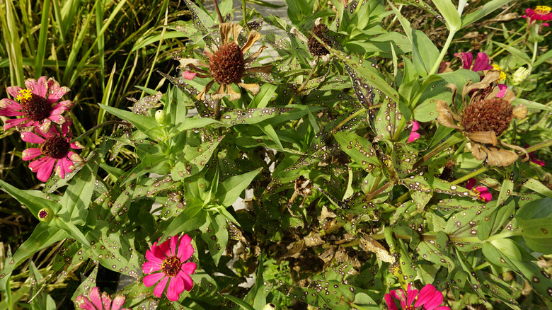 Whiteflies are incredibly tiny, winged insects that wreak havoc on zinnias by feeding on their sap. They're also prolific reproducers and the sheer number that can accumulate on a single plant is way more than you're probably thinking — never mind an entire zinnia patch. Whitefly infestations lead to yellowing leaves, stunted growth, and a sticky residue called "honeydew" coating the plant and flower, which attracts sooty mold and other fungal diseases. But beyond the direct damage they can do, whiteflies can also transmit plant viruses, further compromising your zinnia's health.