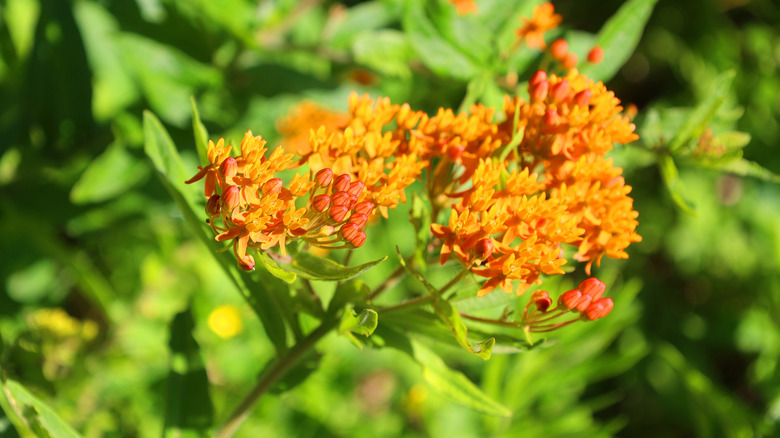 Butterfly milkweed (Asclepias tuberosa) is a hardy perennial with bright flat-topped clusters of orange flowers that butterflies, native bees, and bumble- and honeybees simply can't resist. As high-maintenance as it might appear, butterfly milkweed plants don't require a lot of water and can thrive in full sun and well-drained soil. This ornamental flower's blooms are well-suited for Zones 3 through 9 from late spring to early fall, making any yard look incredibly lush and decorative.