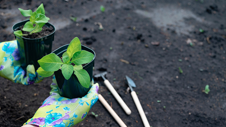 Knowing the right time to transition indoor herb plants outside is only half the battle; you must also know the right way to go about the process. In her exclusive House Digest interview, Tiffany Selvey explains, "Slowly transitioning your plants outside is ideal but not always possible or necessary. It depends on the herbs you're moving outdoors." According to her, mature woody herbs – like rosemary, lavender, and thyme – can be moved outdoors without slowly acclimating to the elements. But if you're transplanting seedlings, you can harden off these plants once they're 10 weeks old. Hardening involves acclimating plants to outdoor conditions by gradually increasing sun and wind exposure.