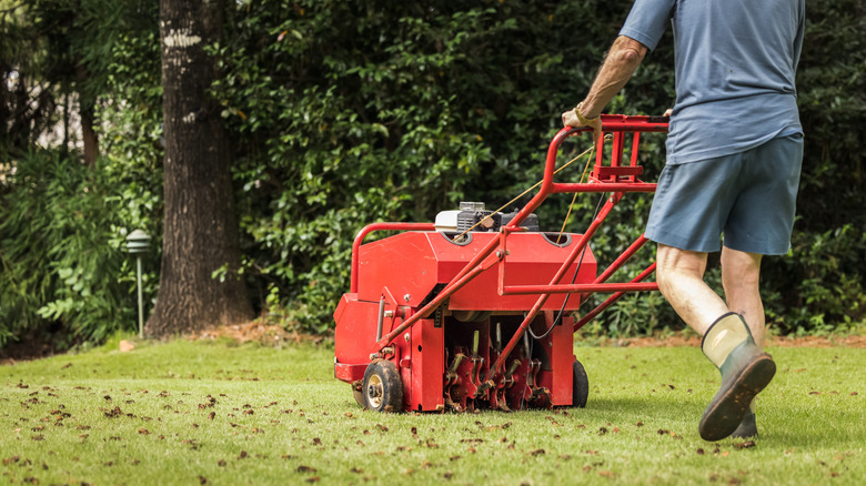 The next step is aerating the lawn, which allows nutrients to reach the roots of the grass. When grass undergoes a lot of stress, aerating is important for reducing the soil compaction that often accompanies it. You can aerate the lawn with a manual spike aerator or by using an aerating machine, which pulls plugs of soil out of the ground. You may have to rent the machine, but it's the most effective option.
