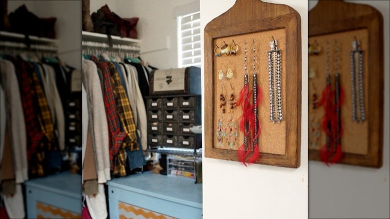 Turn an old cork board into a chic jewelry organizer. Add pushpins, picture hooks, or small nails to hang necklaces and dangly pieces. Use another part of the board to hold earrings (not clip ons) and brooches in place, just by sticking them straight into the cork. You can even paint or add decorative molding to the original frame to make it prettier and suit your aesthetic. Use it above the dresser, next to a vanity, or in the closet to add plenty of extra storage for your baubles.