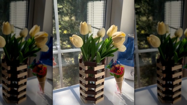 For fans of high-end wood vases, like the chic Thalia wood vase from Wayfair, the beauty and elegance of the piece may justify the higher cost — nearly $80 in the case of the Wayfair piece. However, for those who can't yet afford the piece, there is a less expensive alternative. Make a dupe of the vase from items found at the Dollar Tree for $5 or less. And, really, nothing in terms of style is lost in this dupe. This Dollar Tree DIY hack even allows you to design the same stair-step wooden block pattern that the more expensive piece has.