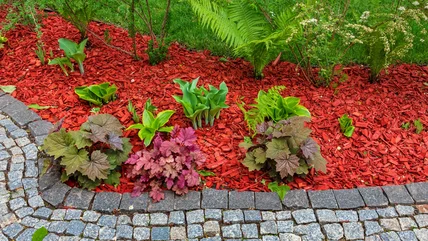 White rocks or color-enhanced wood mulch have been popular options since they can instantly boost curb appeal and are long-lasting. They can add a pop of color to a yard and help landscaped areas stand out. But they also come with drawbacks. They can lend an artificial, unnatural appearance to a landscape, a look you might not prefer these days, as more organic, nature-friendly looks are trending. Even worse, while most wood-mulch dyes aren't toxic, some can contain harmful additives. In addition, wood mulches can be composed of recycled wood products like pallets, which may contain harmful chemicals that you might not want in your garden. Brightly colored mulches also break down more slowly than other types of mulch, which steals nitrogen from the surrounding plants. White rocks can negatively impact the soil's temperature and pH.