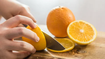 If you're going the oven-dried peel route, preheat your oven to 225 degrees Fahrenheit. Slice off the top ¼ to ⅓ of each orange, scoop out the flesh, and cut a face design. Another adorable option is carving a letter into the face of each fruit to spell a spirited holiday message. Toss the trimmings in the compost bin, or dry them along with the fruit faces; you can use the peel from this juicy fruit as a fire starter.