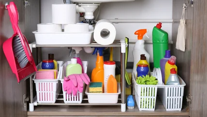 Packed properly, this approach allows for everything to be easily visible and accessible. Just pull it out, grab what you need, and then slide it right back. Easy peasy. But here's the thing. Having the pull-out organizer is really just a nice-to-have. Even going with a static version can improve the functionality of your under-cabinet storage. It's more about forgoing the second level than it is having something that slides in and out. Pro tip: The key to decluttering cleaning products is all in what you buy. Get that right, and you'll be able to organize like a pro right out the gate.