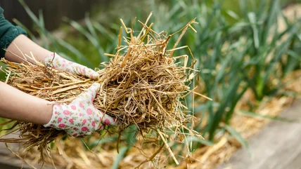 There are several types of organic mulch you can purchase, including wood chips, shredded bark, and straw. However, you can find free, eco-friendly mulch options right in your backyard. Fallen leaves, dried grass clippings, and pine needles all make great options to suppress weeds, retain soil moisture, improve soil texture, and enrich the soil. Start with a 2- to 4-inch layer of much on top of the soil, and once it decomposes, you can work it into the soil.