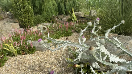 Grasses always add a nice accent to gravel gardens, like switch grass (Panicum virgatum). This ornamental, perennial grass is native to North Carolina but can be found all over North America. Switch grass is hardy in zones 5 to 9 and grows best in full sun. It can handle a variety of soil moisture levels, from dry to wet. It is very adaptable, making it ideal for gravel gardens. Switch grass is also a great plant for wildlife, as it's a source of shelter and seeds for many different species.