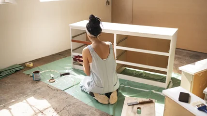 For a clean look, measure and cut thin pieces of trim with a jig saw, then attach it around the drawer front with wood glue. Gently sand with 120-grit sandpaper if needed, then add a coat of universal primer to the wood. Apply your paint — water-based latex or enamel are great choices — with a small roller, let dry, and add a second coat. Attach your new drawer pulls, and enjoy your vintage-inspired piece.