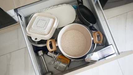Storing pots and pans in cabinets is a headache. If you're like most people, you likely stack them on top of each other in approximate size order and then carefully close the door, hoping not to hear them topple over. Then, cooking becomes a game of Jenga, where you need to carefully move the entire stack to reach the bottom pan, hoping not to cause an avalanche. But you don't have to do it this way. There are some clever adjustable vertical racks designed for pots and pans that you can use instead.