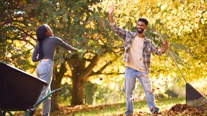 Autumn leaves are beautiful, but they shouldn't be left on the ground for more than a few days. Wet, rotting leaves just don't have the same charm as those that are crisply fallen. Old leaf piles tend to block the sun, smothering grass until fungus eventually grows. If you only have a few smaller trees, then you can knock out the whole yard with a rake and a few trash bags. Whether this is a quick, fun task or a burden depends on the rake you use.