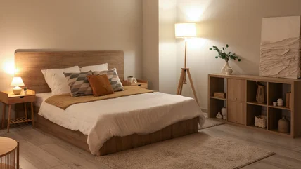 Adding unique bedside lighting ideas helps brighten up your space to make it functional and comfortable. Bedside lamps, floor lamps, or wall sconces are all good options. Strands of lights draped around the room offer a warm glow when the overhead light is off. For all types of bedroom lighting, choose warm lighting ranging from 2,700 to 3,000K for coziness. Lighting with cooler temperatures can work for a reading nook or desk space, but warmer bulbs are generally better for bedrooms.