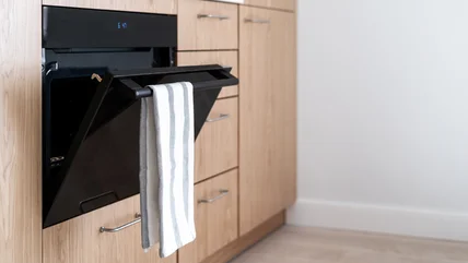 Start by folding your kitchen towel in half – but keep it loose, not perfectly flat. Drape the middle part behind the oven bar so the two ends hang down in front. Then, pull the middle section behind the bar down just enough so you can thread the two hanging ends through the loop that's created. Pull both ends through and tighten to form a knot around the bar. Loosen it a bit for style, and you're left with a kitchen towel that actually stays off the floor and on display without constantly falling or being pulled off. And if you're worried your little ones might tug at the towels with this new and improved way of hanging them, you can always engage the oven's lock feature to keep them from opening it.