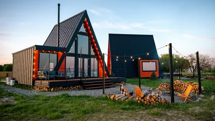 This portable luxury cabin boasts 20-foot ceilings and a strong, galvanized steel frame that aids in weather resistance and the overall durability of the construction. While assembly isn't included, the cabin does come with features to make the process easier, like pre-installed electrical wiring, plumbing, wall panels, and flooring. The airy design includes a full bathroom with a shower and a functional kitchen for cooking meals. The pricing starts at $17,938 on Amazon and includes the cost of shipping, but the design is customizable. You can add up to six rooms, which will affect the price.