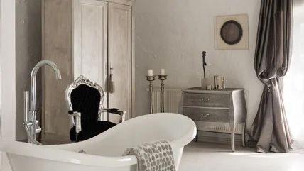 Just because your vanity furniture is freestanding doesn't mean it will work for this trend. The key is to aim for vanities that aren't built-in, yet have enough character and design appeal that they could work outside the bathroom as well. Rather than designs that are ultra-sleek and modern, antique styles with unique details or vintage characteristics will feel more like furniture and less like a bathroom station. In order to choose the perfect bathroom vanity, it's important to consider function, but style is also a big aspect. Many vanities work as a focal point in the bathroom, and the design you choose can set the tone for the entire room, with vintage styles offering some character-rich benefits. Think about the kind of mood you want that "character" to bring in. A dark, carved piece can make a small bathroom feel moody, whereas a lighter, painted cabinet with ornate legs might read more airy and romantic.