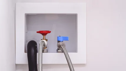 You can use the IKEA TISKEN towel rack with suction cups to say goodbye to the eyesore of washing machine hookups. You don't even have to drill any holes in your wall to install it. Mount the towel rack above whatever you want to hide, such as unsightly pipes or wires, and hang a pretty towel over it. You can also use it to store hanging laundry tools, like brushes, fabric scissors, a Unicca Small Foldable Tabletop Ironing Board, or even a Jautokerdar Extra-Large Hanging Storage Organizer.