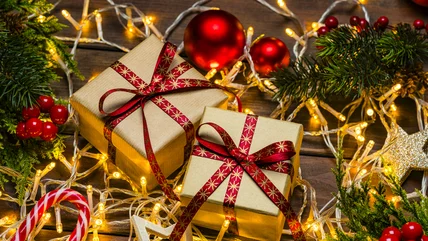 This holiday DIY decor requires a package of Cooking Concepts Bamboo Skewers, a roll of Premier Just Yarn, and a roll of Christmas House Wire-Edge Ribbon. For the lights, you'll need to add a set or two of Christmas House Multi-Color LED Lights, though you could also buy the warm white lights if you prefer. All of these items are found in-store or online, coming in at around $15 for the complete project. You'll also need a durable cutting tool and hot glue. Once you have your supplies together, you'll find the presents are easy to assemble. You will lay out the skewers and create large squares by attaching them to each other, then decorate accordingly with lights and ribbon.