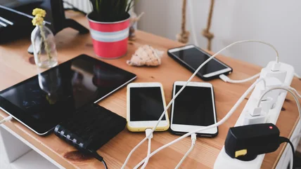 While you wait for that to dry, stick a piece of hook-and-loop tape to the bottom of one of the power strips. Place the tape's counterpart on the bottom of the drawer. Place the power strip inside the drawer, matching up the pieces of hook-and-loop tape. Do that in all of the drawers. Next, push the cord on each of the power strips out of one of the holes in the drawer, and plug the cord into an outlet. Place your electronics in the drawers and plug them into the power strip to charge. Finally, you may want to reserve the bottom two drawers for bigger items, like laptops, to ensure the storage unit remains balanced.