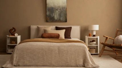 Once you select your ideal natural material headboard, it's time to pick out more fresh minimalist decor to complete your bedroom retreat. Remember, we're still aiming to avoid clutter. Move intentionally while considering what elements will add value to your bedroom space. Pair warm neutrals with earthy, dusty tones. Some great colors to consider as accents are terracotta, olive, and mustard. Your room should have an organic, soft flow rather than a sharp and overly structured feel. Play with rounded elements such as paper pendant lights, curved armchairs, or cloud-like throw pillows. Follow through with more natural materials across the space. Linen, leather, sheepskin, and bronze all lend nicely to a cohesive, warm minimalist design.