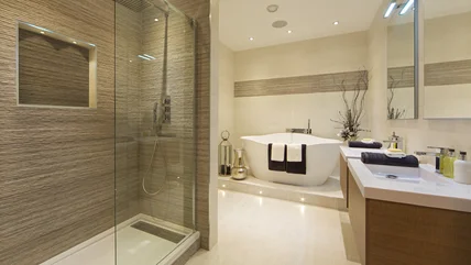 You might be used to harsh lights that bombard you in the shower, but there's no need to sacrifice the ambiance of the space. There are a wide array of lighting fixtures and options that you can explore. Everything from dimmable lights to bulbs that allow you to change the color can be easily installed in your bathroom for a more luxe feel. If you're interested in completely revamping the space, select a lighting fixture that matches the rest of your bathroom. Make sure it is suitable for use in a shower setting.