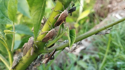 A regional southeastern bug, rice stink bugs (Oebalus pugnax) are identifiable by their straw-colored, greenish-yellow hue. Only up to 1/2 inch long, they develop among wild grasses, and as their name would suggest, they fly towards and feed on rice and sorghum, a superfood you can grow in your own yard. You'll know if you have these bugs on your crop, however, if you observe yellow and black spots on the plant. While weed management is an effective prevention tactic, insecticides should be used if the infestation gets bad. Just don't spray within two weeks of harvesting your sorghum.