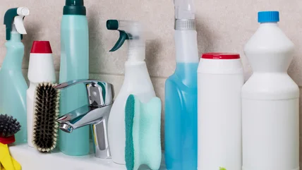 To maximize under-sink space and keep cleaners off your bathroom countertops, repurpose a Dollar Tree paper towel holder into an under-sink hanger. First, position the holder horizontally on the inside of the cabinet — it will stick out from the wall. Ensure there's enough space above the holder for the spray head. Using either screws, brackets, or adhesive strips, mount the base of the holder to the wall. Hang the cleaners over the horizontal bar by their heads. You have a streamlined storage solution that keeps those unattractive bottles contained.