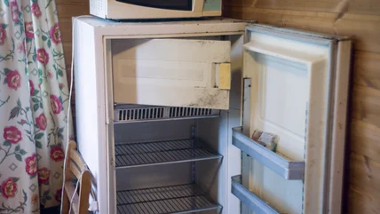 Luckily, you don't really have to worry about the state of the fridge you find for this project because you're going to clean it. Start by unplugging the fridge, if it was plugged in. Now, it's time to deep clean the interior. Remove all the shelves and drawers, using your screwdriver as needed for the door and handles. Wash these fixtures individually with hot water and dish soap. Then use a mixture of equal parts vinegar and water to wipe down the fridge's interior. If there are any lingering food smells, wipe the interior using a solution made by dissolving two tablespoons of baking soda in one cup of hot water. Avoid using harsh cleaners, which can damage the interior of the fridge. Wipe the exterior clean with a rag or sponge soaked in hot water and dish soap.