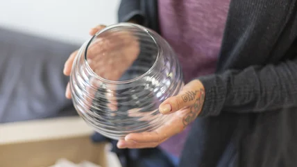 First, apply a circle of craft glue around the base of one of the vases. Then secure the other vase's base on top. Because you're gluing the two vases together, you need to make sure that the bond of the glue is solid before you move on to other parts of this project. While glues like E6000 will start to set within 10 minutes of application, they won't be fully dry for 24 to 72 hours. If you grab onto the vase or turn it over while you're painting it, you run the risk of breaking the glue bond. As such, it's best to wait to paint the piece until the glue is completely dry.