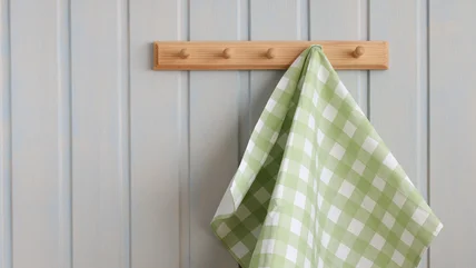 The first part of this DIY involves creating a curtain using a tea towel. This curtain can be used to cover up a small window or hide an open-shelving storage area. In any case, you'll first need to measure the area that the curtain needs to cover and make sure that the tea towels are the right size. Allow for 2 or 3 extra inches for both width and length, both to create the fold required for the curtain rod and to add some draping.