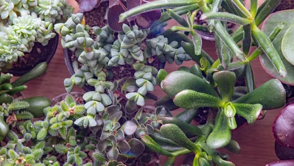 Flapjacks (Kalanchoe thyrsiflora 'Flapjacks'), which has several other common names, including paddle plant and dog tongue, is among the succulents that grow beautifully indoors throughout winter. This succulent makes its statement with large, paddled-shaped leaves that turn red at the edges if they get enough sun exposure. You may notice a powdery substance on your flapjacks that makes you question whether you have dust on your succulents. It's actually farina, scientifically known as "epicuticular wax," and it protects your plant, so don't try to rub it off.