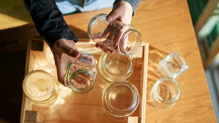 Your first order of business is taking off that pesky label. You can remove it with a straight razor, but this can be tedious and often leaves behind stubborn residual adhesive. Easily remove labels from glass jars by heating it up with a hair drier and peeling it off. If that doesn't do the trick, try creating a DIY goo gone solution. All you'll need is baking soda and vegetable oil. Mix 2 parts baking soda with 1 part vegetable oil. It should form a thick paste. Soak your jar in warm soapy water for 10 minutes and peel off the majority of the label. Spread on your DIY goo gone and allow it to sit for another 10 minutes. Now all that sticky residue should scrub right off with soap and warm water.