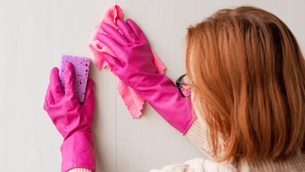 Besides choosing the right sponge for the job, there are steps to make sure you're getting the best possible clean on your walls. Getting any loose dust off the walls first is important, so you don't wind up just moving it around and causing unsightly streaks. Cover a mop or broom with some cloth and use it to give the walls a thorough dusting. You'll also want to inspect the walls to get an idea of the paint on them. If you notice a sheen on the walls, it's a sign that you can apply a bit more pressure when cleaning, but if the walls look or feel flatter or more matte-textured, be prepared to go lightly with the sponge. After you clean (and the method will differ depending on the sponge you use), pat the wall dry with a clean cloth.