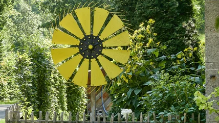 WISLAS' Garden Windmill is another classic option. It comes in several colors — blue, gray, green, red, white, and yellow — and stands 8 feet tall for a bold piece in your yard. The blades start spinning in even a small breeze, and the metal is coated to help it handle outside elements so it will last and continue spinning for a long time. With the fin on the back, it's also able to turn around and face the breeze, no matter which direction it comes from.