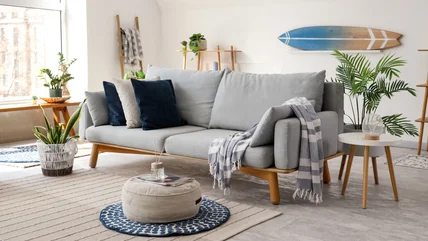 Additionally, some designers suggest choosing a neutral-toned rug that matches the walls or furniture to create a visually continuous effect. Other designers, however, note that this matchy-matchy look might appear dull or boring and suggest that folks experiment with an accent color, which could benefit the homeowner. Further, if you want a small living room to appear more expansive, avoid small, busy patterns or prints on your rug. Instead, opt for larger geometric patterns that introduce unique shapes to the space without being overwhelming. Also, whether you're zoning an area in a studio apartment or simply working with a tiny rectangular living room, some folks point out that round rugs can be an often overlooked secret for styling a gorgeous space. Round shapes introduce gentle curves that enhance the flow of the design and reduce the rigidity of boxy lines.