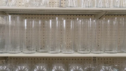This craft is easy to do, yet it relies on careful setting and gluing in the beginning. Use a vase from Dollar Tree, or snag a pillar-shaped glass vase from Amazon (like the Royal Imports glass vase). The bigger it is, the more blocks you'll need. You want the blocks to line up evenly, and creating a perfect base layer will help you set the other ones. Think of the circular base of your vase like a clock, and place one block each, horizontally, at 12, 3, 9, and 9. Hot glue them down, using a single drop of glue to attach each one. Then, use a different color block for the next layer. Stack them on the spaces in between the blocks on the bottom layer to create an alternating effect. Repeat this process until you reach the top, using hot glue to secure the wooden pieces.